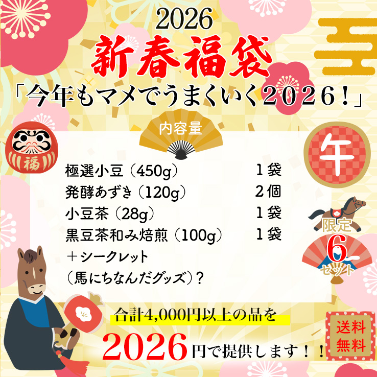 「今年もマメでうまくいく2026!」 新年のスタートに、縁起の良い“豆”をたっぷり詰め込んだ2026年限定 福袋をご用意しました。 【セット内容】・極選小豆(450g)×1・酵あずき(120g)×2・小豆茶(28g)×1・黒豆茶 和み焙煎(100g)×1+🎁 シーク... -